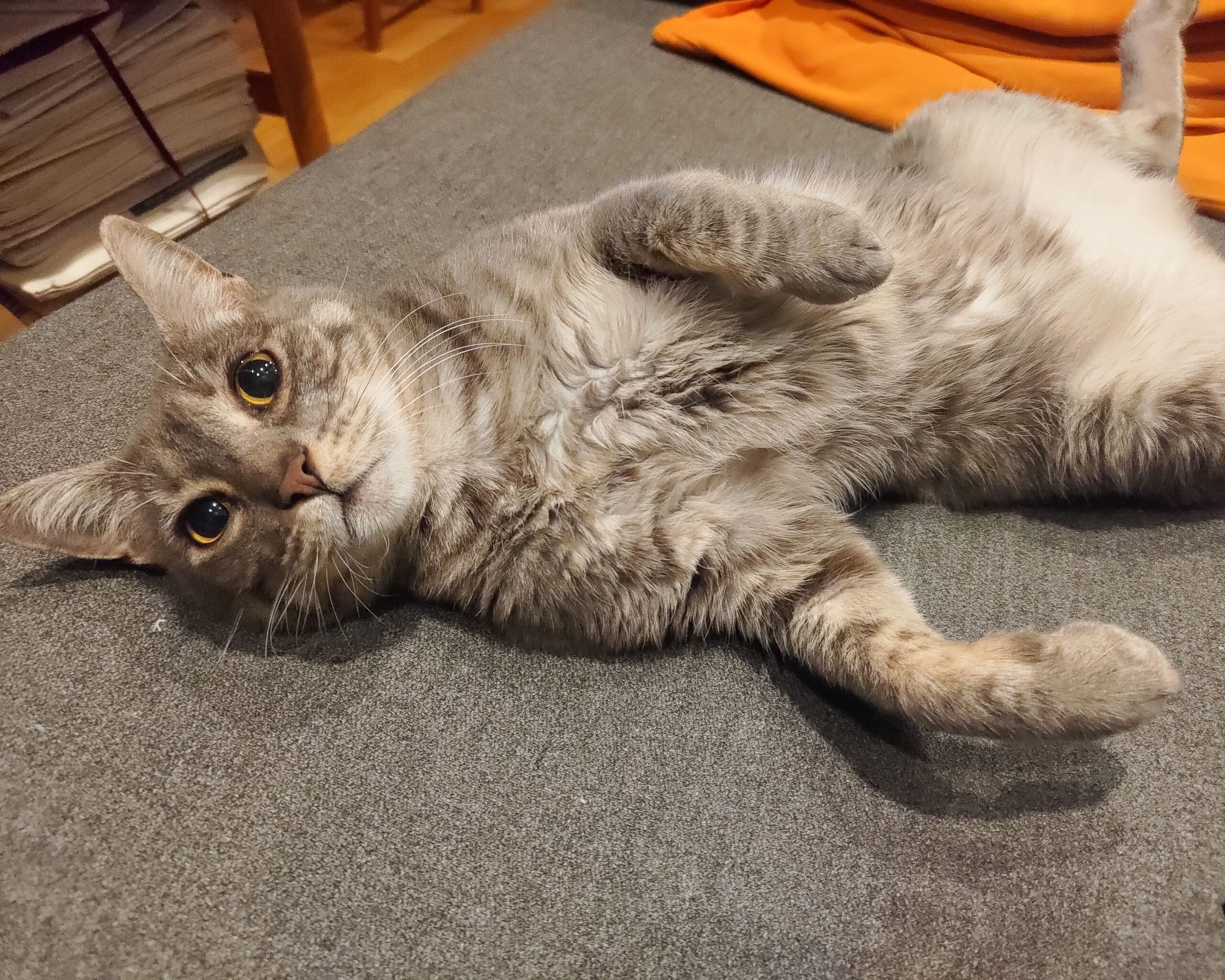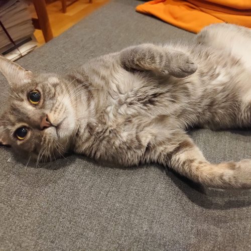 Jeg er nysgjerrig, og flink til å hoppe og leke! Jeg veldig trygg og sosial og synes besøk er veldig stas. Jeg er veldig glad i kos, og tolerer å bli løftet på. Noen uvaner jeg har er å klore litt på møblene, men det er stor sett om jeg kjeder meg.