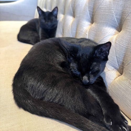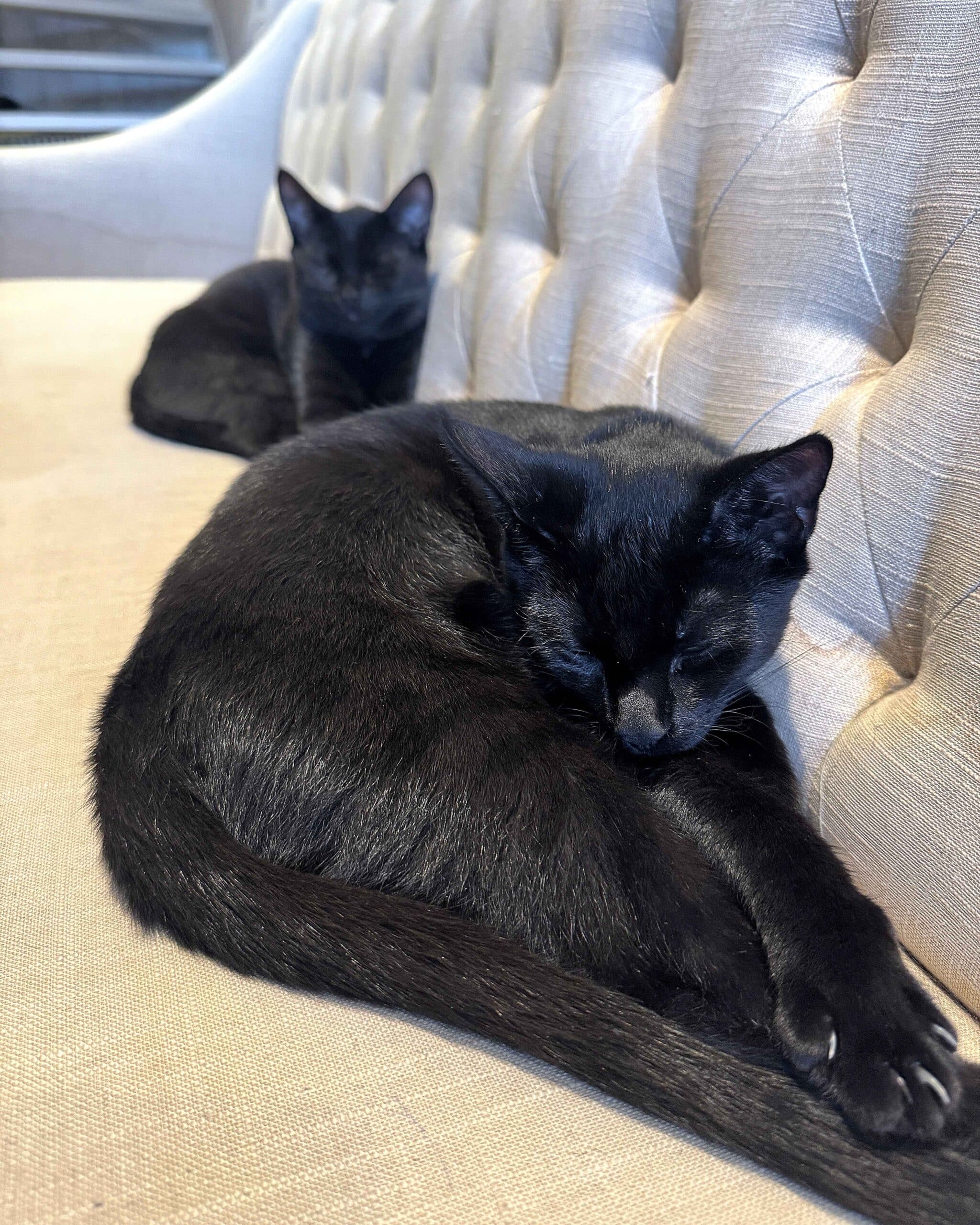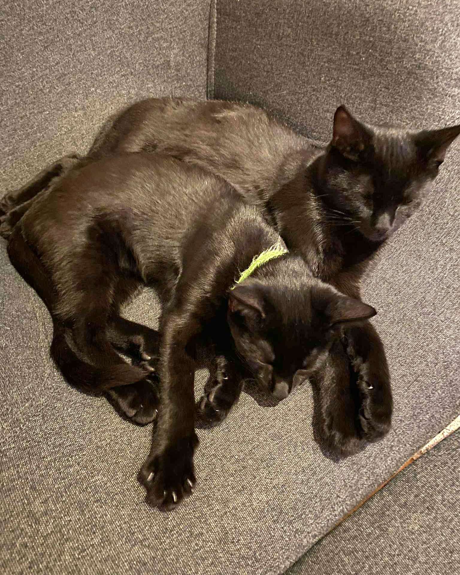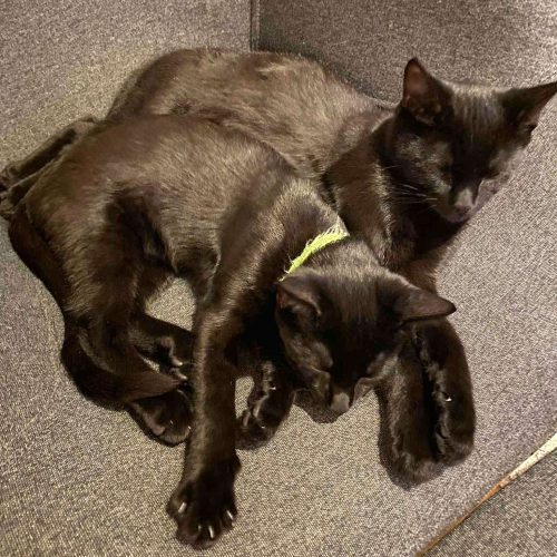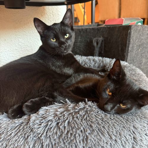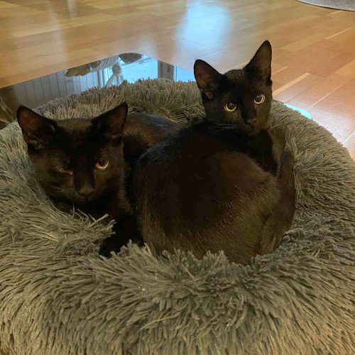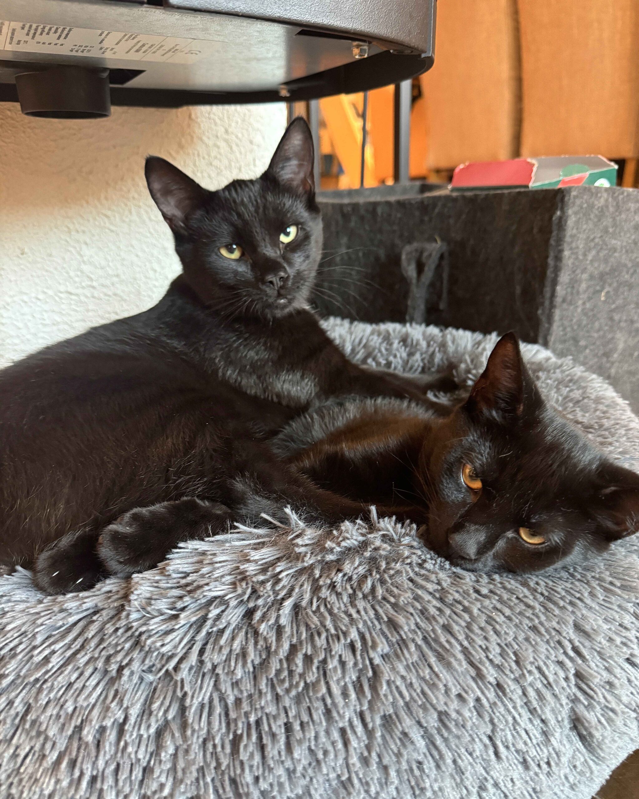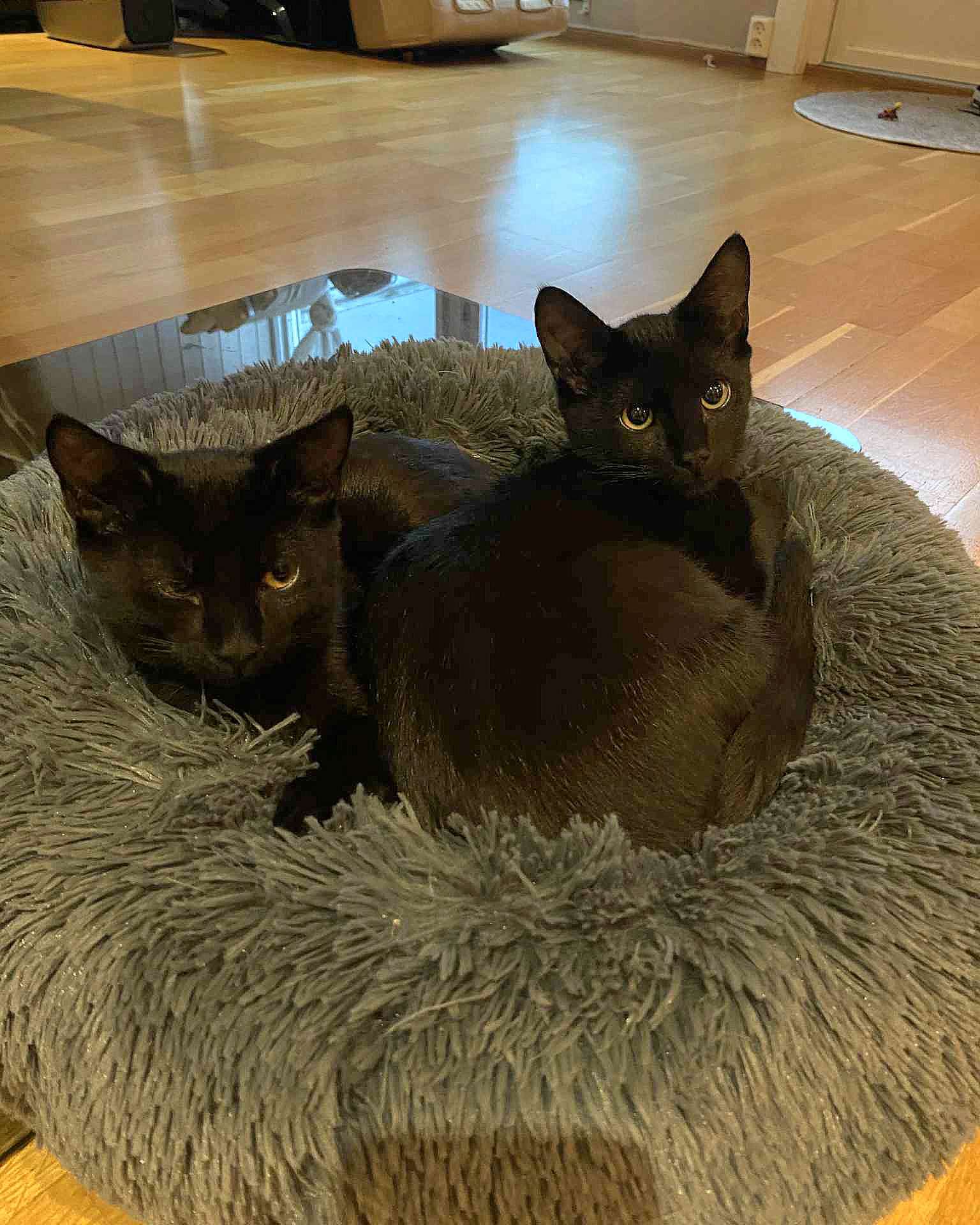 Vi er to gutter, søsken selvfølgelig, som gjør absolutt alt sammen. Spise, leke, kose – der én av oss er, er også den andre. Vi finner godt selskap i hverandre og leker gjerne sammen også, men er du hjemme og kan leke med oss, er det også helt supert. De få øyeblikkene vi ikke leker sammen, finner du oss gjerne sovende sammen. Selv om vi har mye energi, må selv vi lade opp batteriene av og til. Vi er også veldig kjærlige og kosete og ligger gjerne i nærheten av menneskene våre.