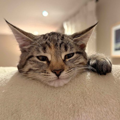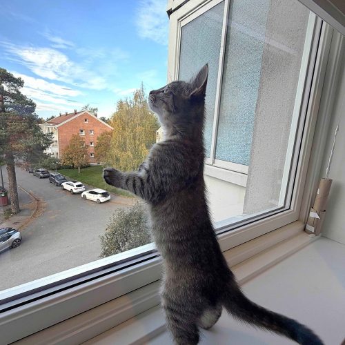 Når jeg er ferdig med å utforske, trekker jeg meg ofte opp i høyden. Jeg elsker å sitte i klatrestativet, på sofaryggen bak skuldrene dine eller gjemme meg i en god pappeske. Å ha oversikt gjør meg trygg, og jeg liker å følge med på alt som skjer rundt meg.