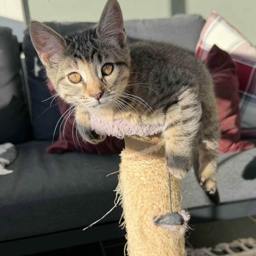Hei, jeg heter Juno – eventyrer, oppfinner og profesjonell pappesketester. Jeg er en trygg, livlig og selvstendig kattunge som elsker å ha det gøy. Jeg finner lek i absolutt alt: papirlapper, hårstrikker, lokk og klinkekuler. Ingenting er for smått til å bli en leke. Jeg er også flink til å oppdage ting jeg kanskje ikke burde undersøke, og det hender jeg prøvesmaker det jeg finner, så litt tilsyn er lurt.